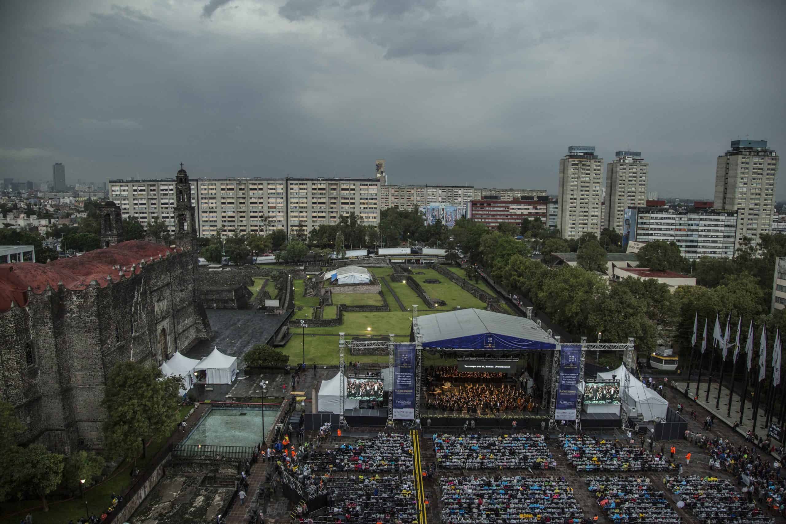 La música atravesó muros. Se filtró por paredes de piedra que construyeron los Tlatelolcas antes de la conquista; avanzó por el grisáceo templo de Santiago, del siglo XVI; y llegó a los rincones de los edificios modernos que albergan a miles de familias desde los años sesenta. Tlatelolco, escenario de algunas de las peores tragedias en la historia de México y lugar de la muerte durante el terremoto de 1985, fue invadido por sonidos armónicos: 93 músicos, cuatro solistas y decenas de coristas dirigidos por el español Plácido Domingo interpretaron el conmovedor Réquiem de Giuseppe Verdi, al cumplirse 30 años del terremoto que dejó entre 30 y 50 mil fallecidos.
