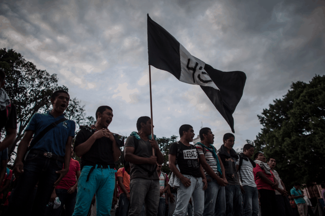 Una bandera mexicana teñida de negro con un 43 en el centro ondeó en Tixtla, capital del estado de Guerrero, donde no hubo festejo por la Independencia de México. Una manifestación solemne reemplazó a la tradicional ceremonia del “grito” y en lugar de pirotecnia y música se escucharon consignas para exigir la presentación con vida de los 43 estudiantes desaparecidos desde el 26 de septiembre de 2014.