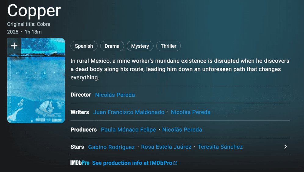 audiovisual/Featured/production Copper Production 16 December, 20259 April, 2026 It was an honor and I really enjoyed to produce all the filming of the movie Cobre (Cooper), directed by Nicolás Pereda.A fiction with and incredible cast, starring by Lázaro Gabino Rodríguez, Teresita Sánchez, Rosa Estela Juárez and Harold Torres.Photography by Miguel Tovar.Premiere in 2025. compartir Facebook Messenger Twitter Whatsapp Email etiquetas cineMéxicoNicolas Peredaproducción puede que le interese In Real Life: Blocking The Sun 8 October, 20239 April, 2026 Masala y Maíz: All About Liberty | Mini Docs 28 April, 202331 July, 2023 Mexican National Journalism Prize 1 February, 202322 January, 2025 Leave a Reply Cancel replyYour email address will not be published.