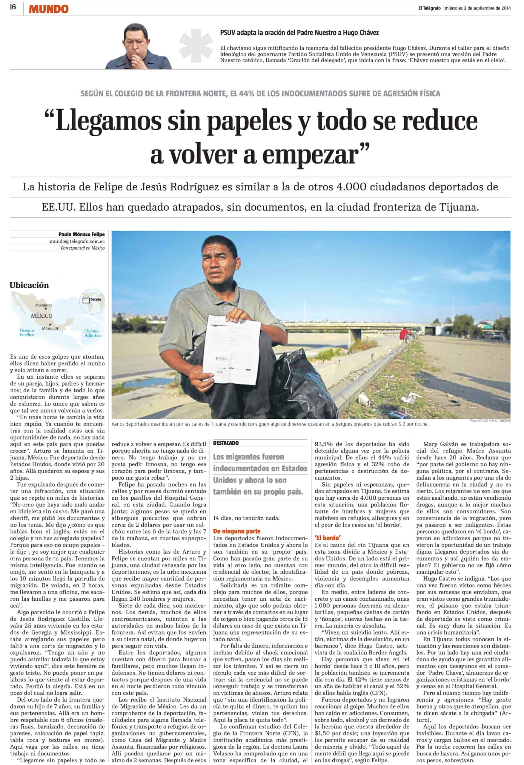 Textos Llegamos sin papeles y todo se reduce a volver a empezar 3 septiembre, 201427 julio, 2020 compartir Facebook Messenger Twitter Whatsapp Email etiquetas deportadosEl Telégrafomigración puede que le interese Abriendo grietas 26 enero, 202125 febrero, 2021 Después de la guerra, capítulo México 18 abril, 201927 julio, 2020 Entre carpas y refugios esperan frente al muro 20 noviembre, 201814 septiembre, 2020 Deja un comentario Cancelar respuestaYour email address will not be published.