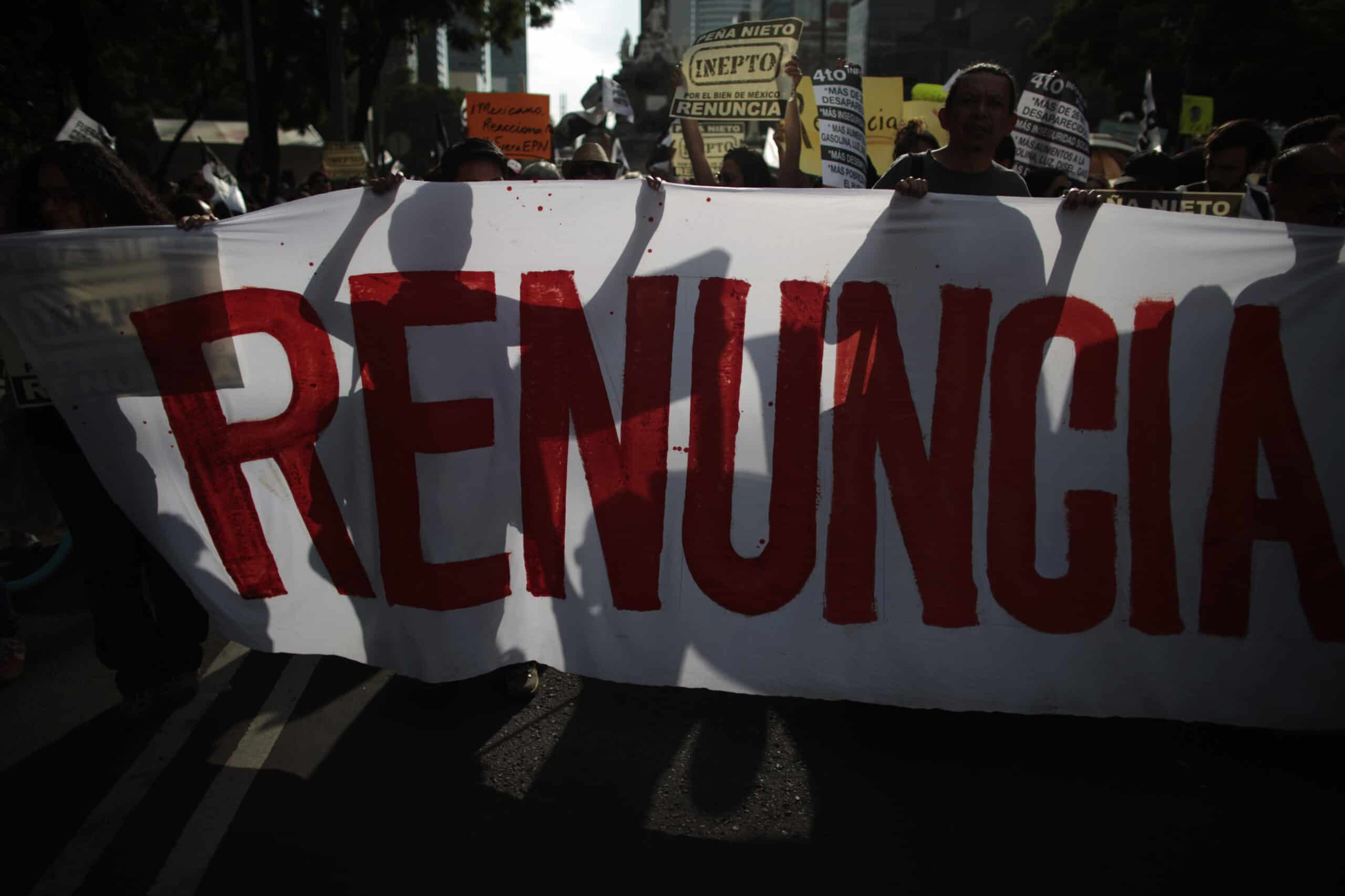 ‘Peña Nieto, inepto. Por el bien de México, renuncia’, decía uno de los carteles impresos que distribuyeron entre los asistentes. Otros cientos cargaron cartulinas escritas a mano con mensajes como: ‘Renuncia ya. Los motivos sobran’. ‘Fuera Peña. Eres una vergüenza para México’.