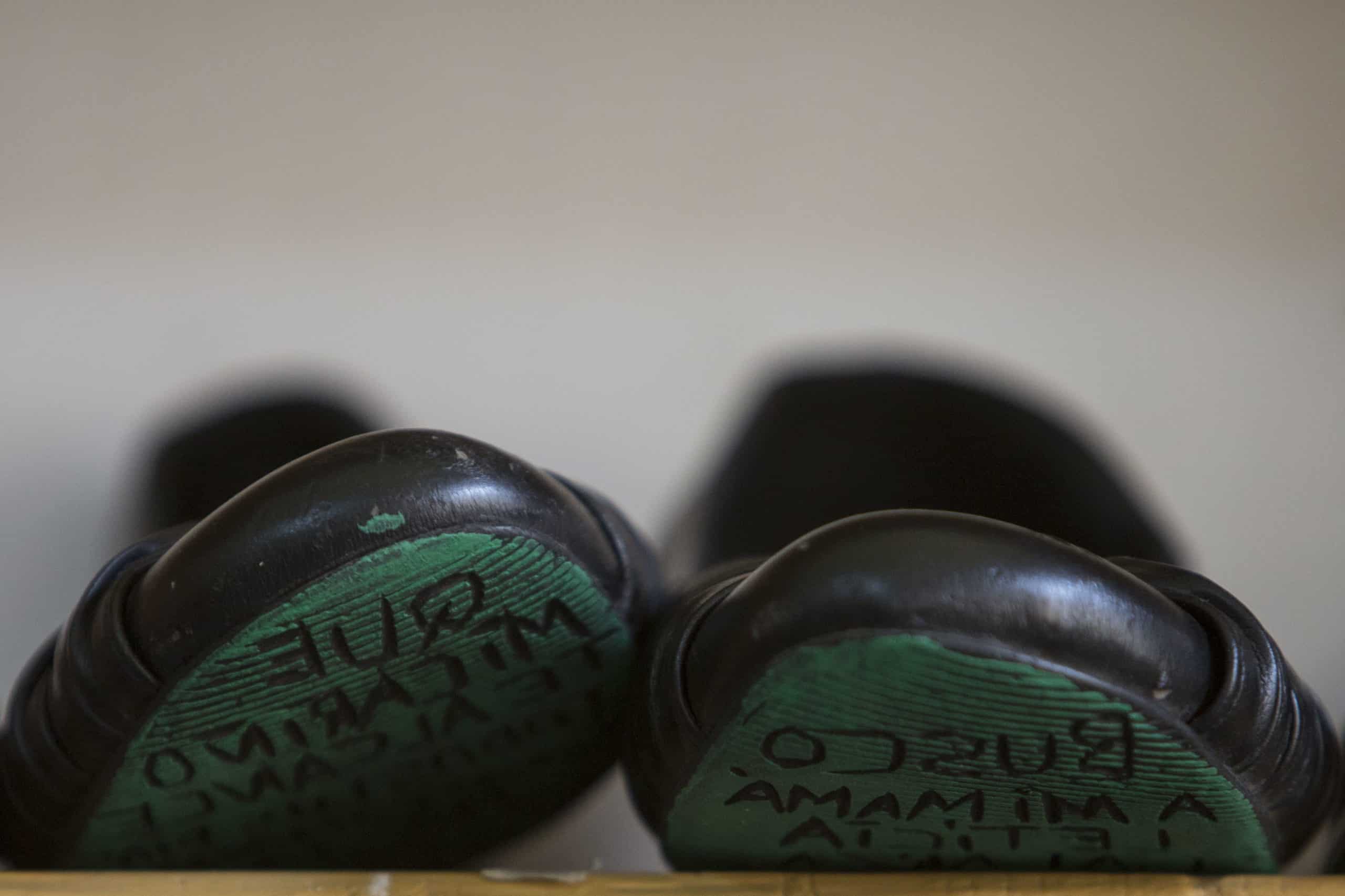 Unos mocasines negros de tacón bajo son los primeros que trabajó. Pertenecen a Leticia Hidalgo, madre del estudiante Roy Rivera Hidalgo, desaparecido por policías en la ciudad de Nuevo León, estado de Monterrey. Su suela cuenta: “Me llamo Letty Hidalgo y busco a mi hijo Roy. Fue desaparecido el 11 de 2011”.