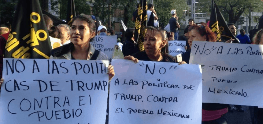 Este 20 de enero hubo varias protestas espontáneas en la capital mexicana. Carteles y gritos en el Ángel de la Independencia por la mañana, mientras Trump juraba en Washington. Más tarde una manifestación recorrió la avenida Paseo de la Reforma, encabezada por un monigote con rostro de Trump. Con ritmo de tambores y consignas antiimperialistas la dirigían organizaciones políticas de izquierda.