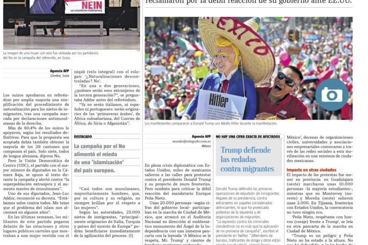 El Telégrafo, Ecuador Lunes 13 de febrero de 2017, sección Mundo, página 16 Paula Mónaco Felipe, corresponsal en México Miles de personas, sobre todo de clases medias y altas, marcharon este domingo